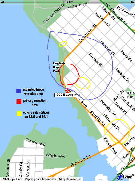 Our best reception is in the vicinity of the 1600 block of Harwood and Burnaby streets, the 1700 block of Beach Ave., and the adjacent park. Best car reception as you drive is along 1600 Burnaby. To hear for a longer duration, you can park in the 2 hr parking zone on Bidwell St. next to the park. Car radio reception is quite good in these areas, but walkman reception is terrible pretty much everywhere. Of course, if you come to the park for a picnic, a portable with an antenna should be good enough.